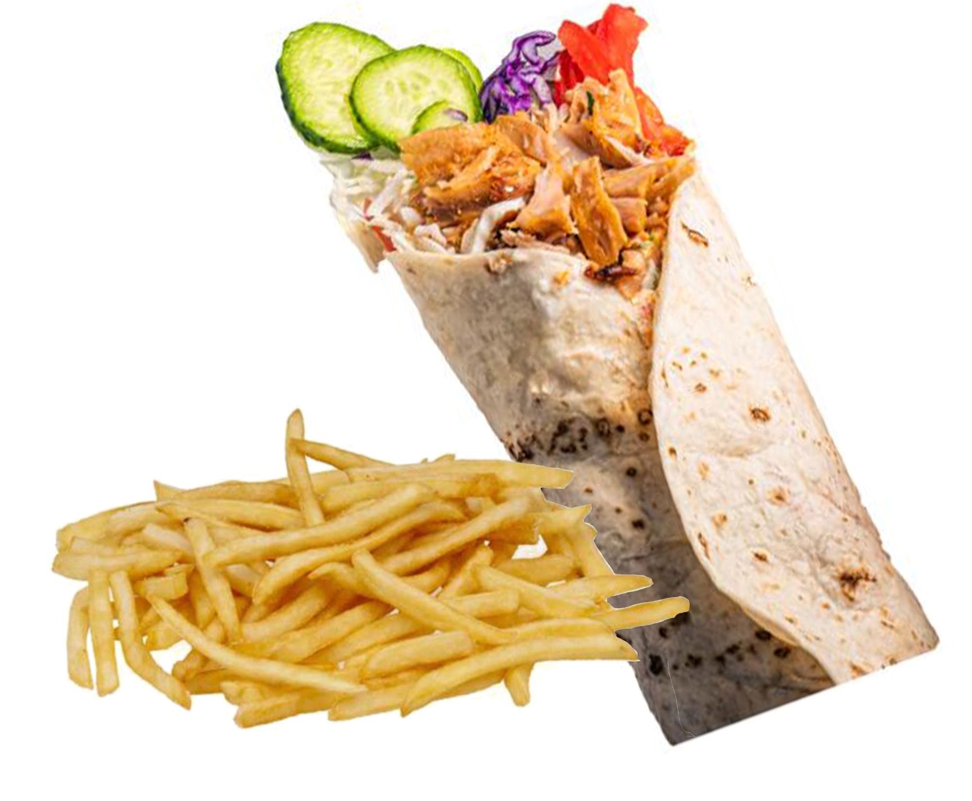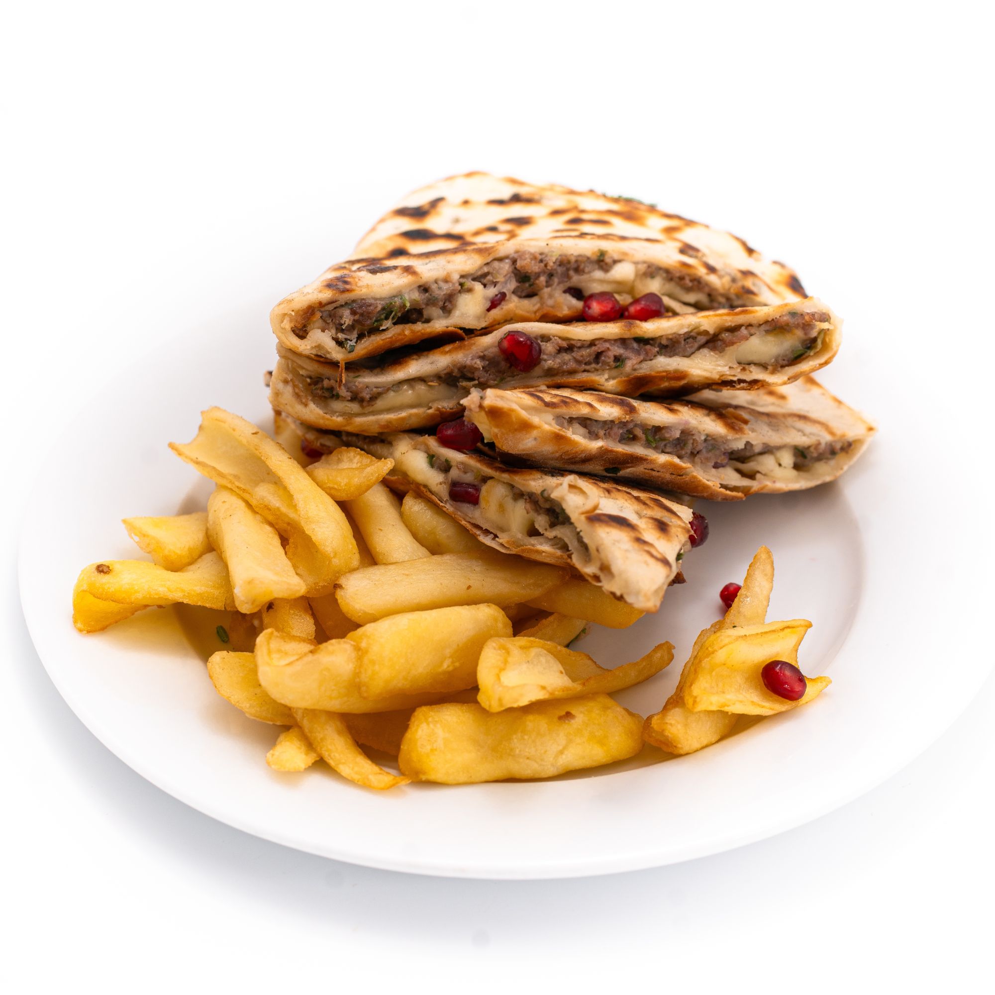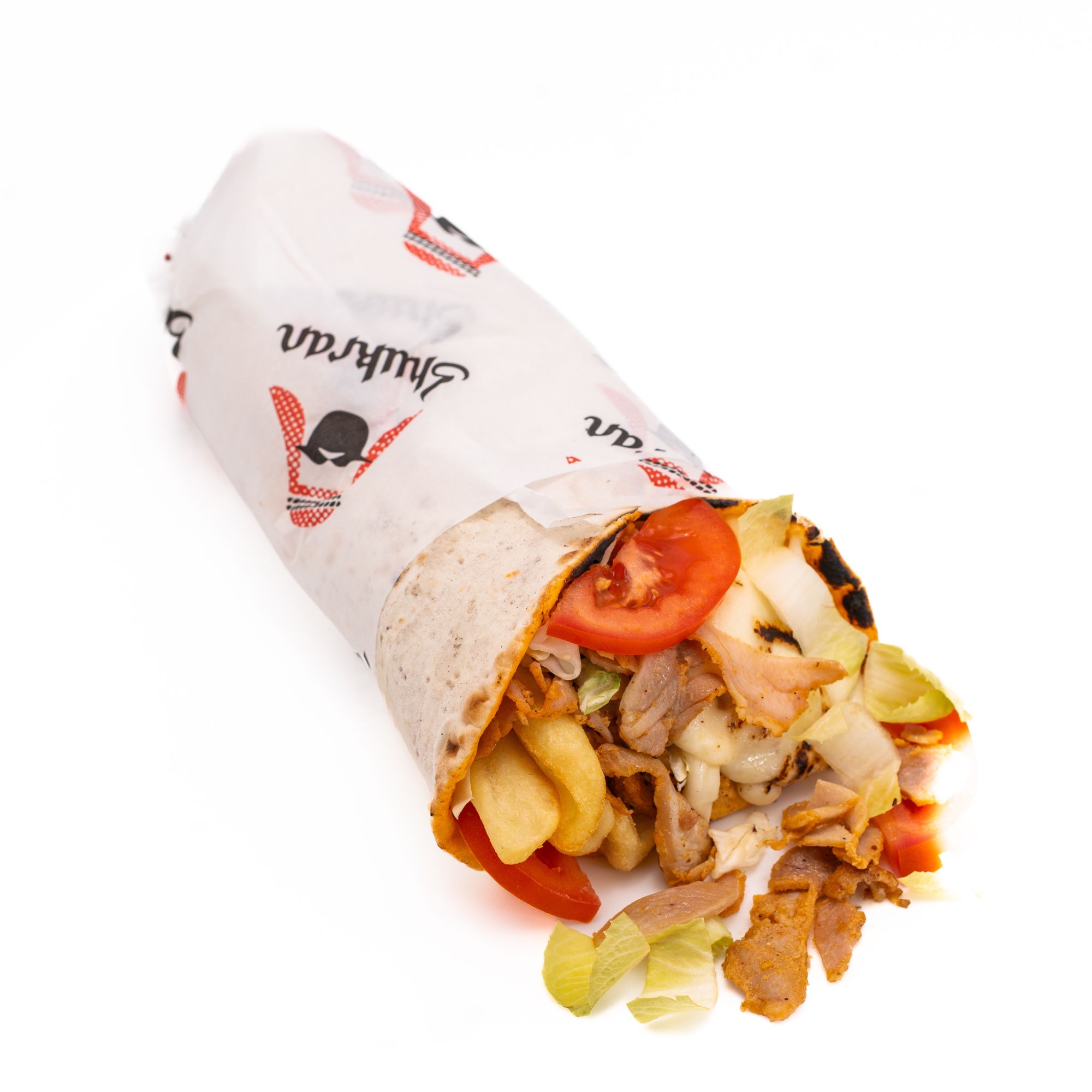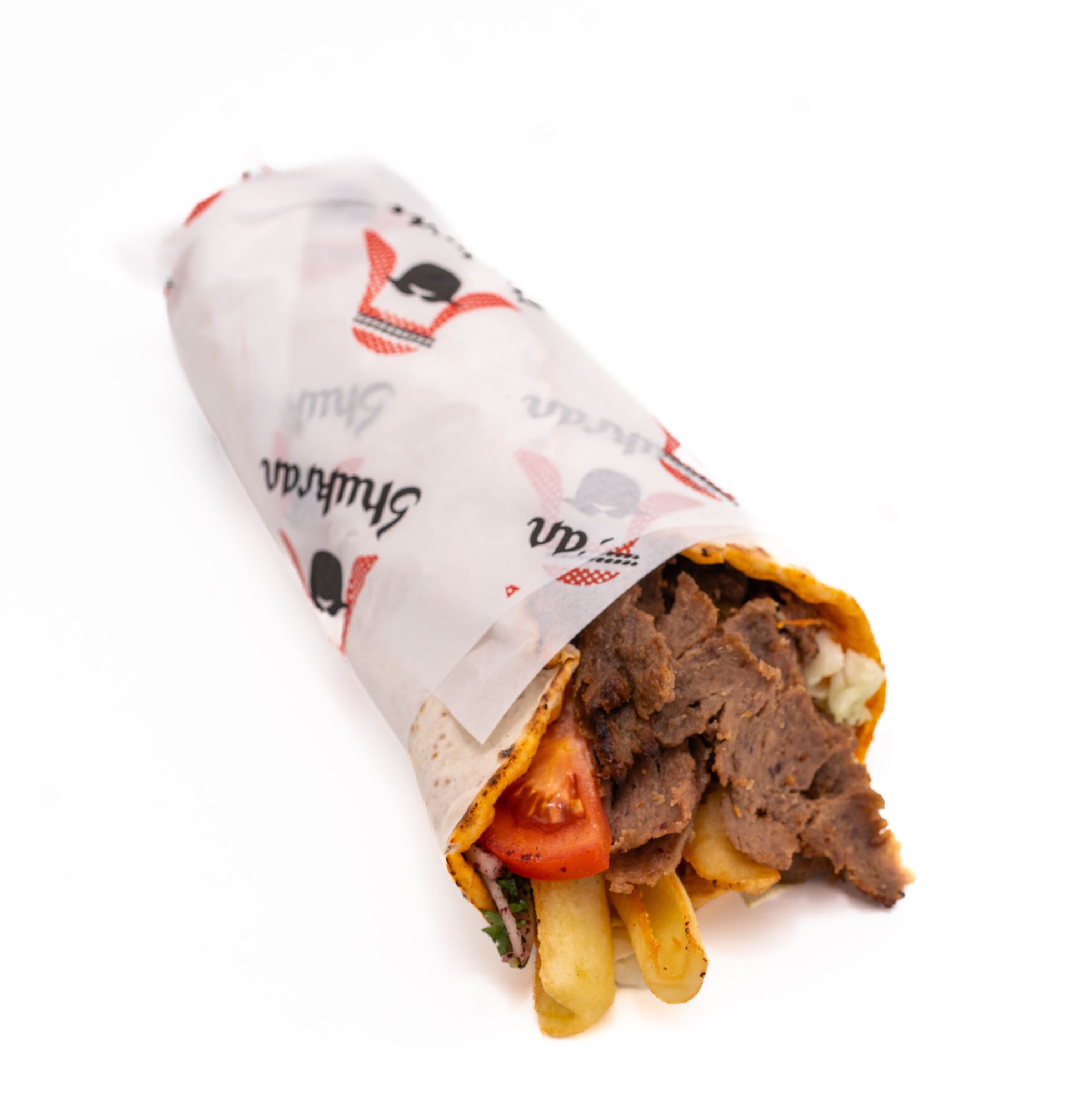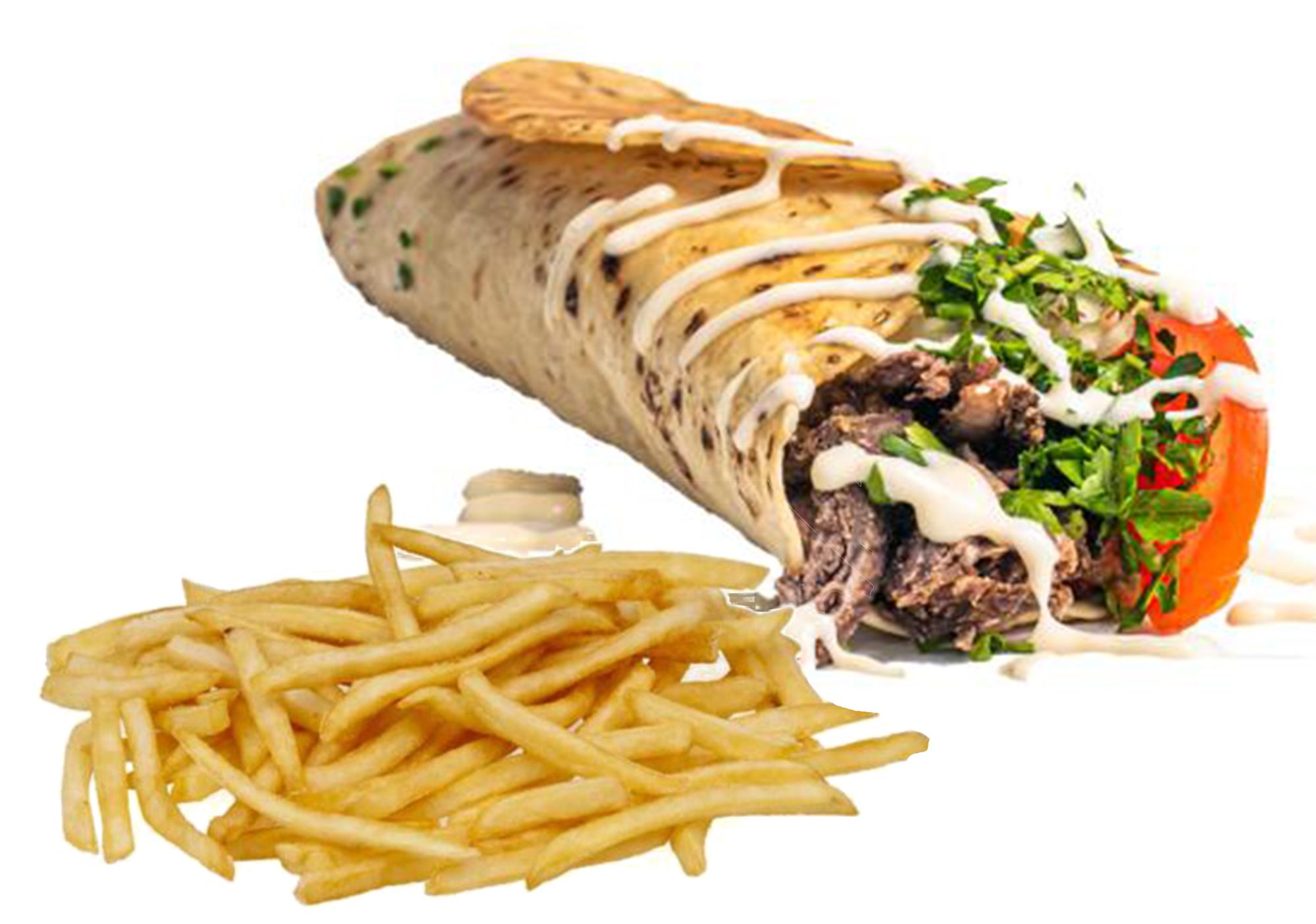 lipie 80g, carne 180g, cartofi prăjiți 150g, castraveți murați 40g, ceapă 30g, roșii 30g, pătrunjel 7g, sos rodie 30g, sos tahini 30g