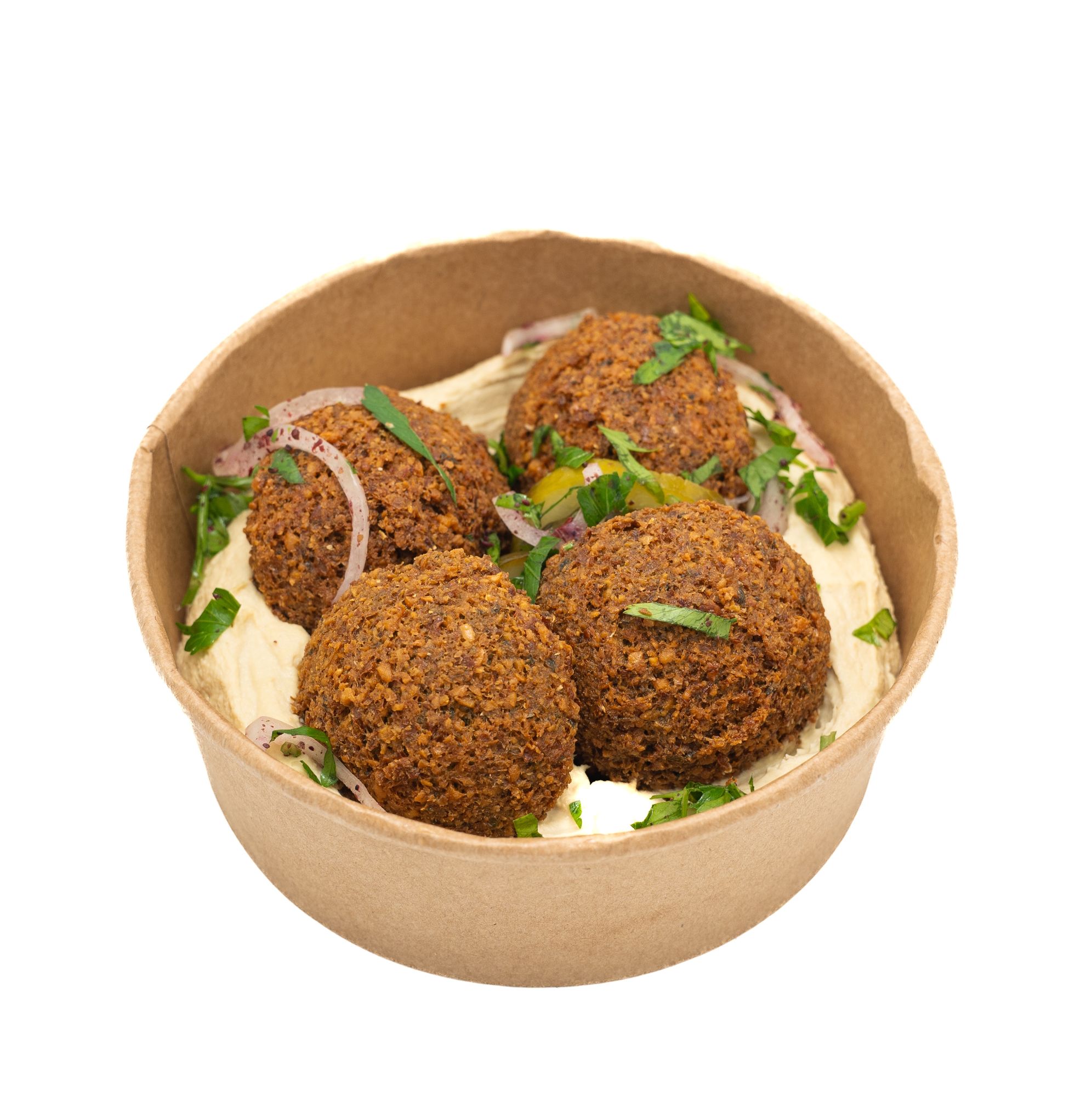 năut mixat cu tahini 2--g, ulei măsline 10g, falafel 180g, varză 60g, ceapă 20g, roșii 20g, castraveți murați 20g, pătrunjel 5g, rodii, pâine 50g